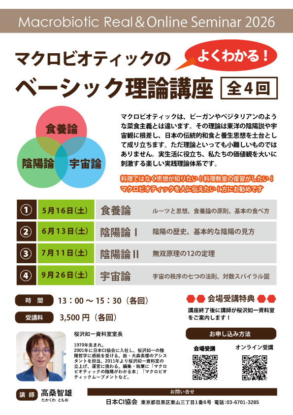 ※このセミナーは、マクロビオティック クッキングスクール リマの理論講義をセミナー用にしたものです。あらかじめご了承ください。